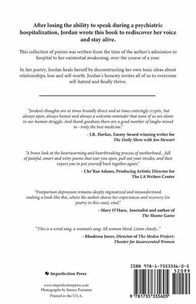 This collection of poetry is for all the hearts that have done everything "right" but still end up in a gutter- all the people who are pissed off and unfulfilled, and who are able to laugh at themselves. No more lies. No more pretending. Whether we have lost our self-concept to our own broken childhoods, to parenthood, to careers, to marriages, to the wrong lovers- it is time for us to champion one another's truths, to embrace our worth and to dispel toxic expectations of perfection. Borne out of the author's postpartum depression journey (and subsequent nervous breakdown) and sexual awakening in her thirties, Jordan's poems explore the interweaving of relationships, loss, healing, and self-worth. This collection follows the trajectory of self-exploration through relationships that have broken down and brought her closer to herself, prior to and in the aftermath of hospitalization- predominantly, the abandonment of Jordan's mother, a trauma which only manifested once her own baby was placed in her arms. Jordan's bicultural marriage and experiences as an immigrant in Great Britain further highlight the complexity of one modern woman's quest for personhood.
