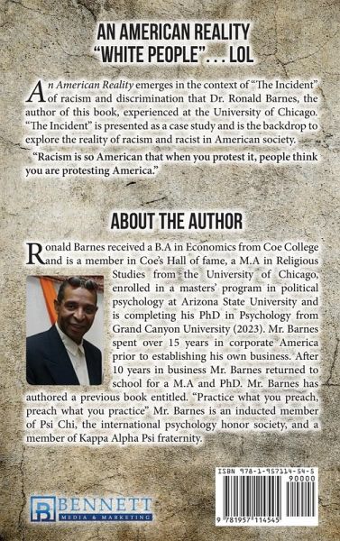 An American Reality emerges in the context of "The Incident" of racism and discrimination that Dr. Ronald Barnes, the author of this book, experienced at the University of Chicago. "The Incident" is presented as a case study and is the backdrop to explore the reality of racism and racist in American society. "The Incident" encountered by Dr. Barnes is a microcosmic example of experiences encountered by millions of minorities historically and today, on a daily basis. Anyone who gives the concept of racism any significant thought has to conclude it is a mindset that only the most simple-minded, the most ignorant, the most devious, the most unethical, or the most immoral people on earth subscribe to. The stupid mentally retarded racists are a virus in white culture and American society. For this reason, the reality of White racism is relevant to present as the topic of this book. Racism has become so prevalent and identifiable with American Society that it is normal behavior for White people to be racists or to act with "racist residue". It is empirically established that people have a "bias blind spot," meaning that they are less likely to detect bias in themselves than others are.