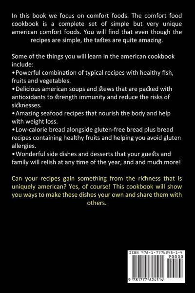In this book we focus on comfort foods. The comfort food cookbook is a complete set of simple but very unique american comfort foods. You will find that even though the recipes are simple, the tastes are quite amazing. Some of the things you will learn in the american cookbook include: ¿ Powerful combination of typical recipes with healthy fish, fruits and vegetables. ¿ Delicious american soups and stews that are packed with antioxidants to strength immunity and reduce the risks of sicknesses. ¿ Amazing seafood recipes that nourish the body and help with weight loss. ¿ Low-calorie bread alongside gluten-free bread plus bread recipes containing healthy fruits and helping you avoid gluten allergies. ¿ Wonderful side dishes and desserts that your guests and family will relish at any time of the year, and and much more! Can your recipes gain something from the richness that is uniquely american? Yes, of course! This cookbook will show you ways to make these dishes your own and share them with others.