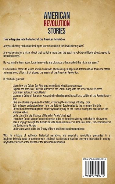 Take a deep dive into the history of the American Revolution. Are you a history enthusiast looking to learn more about the Revolutionary War? Are you looking for a history book that contains more than the usual run-of-the-mill facts about a specific historical event? Do you want to learn about forgotten events and characters that marked this historical event? From unusual heroes to lesser-known narratives showcasing courage and determination, this book offers a unique blend of facts that shaped the events of the American Revolution. In this book, you will: Learn how the Culper Spy Ring was formed and what its purpose was Explore the stories of Guerrilla Warfare in the South, along with the life of one of its most prominent actors, Francis Marion Learn who Deborah Sampson was and why she disguised herself as a soldier of the Revolutionary War Dive into stories of pain and hardship, exploring the dark days of Valley Forge Gain a deeper understanding of how the Battle of Saratoga led to the turning of the tide Unveil the heartbreaking tales of betrayal and loyalty on the frontier during the conflicts in the Mohawk Valley Understand the significance of Benedict Arnold's betrayal Learn how Daniel Morgan's tactical genius led to an American victory at the Battle of Cowpens Take a voyage through the tumultuous life and naval career of John Paul Jones, the commander of the Bonhomme Richard Understand what led to the Treaty of Paris and American independence With its mixture of authentic historical narratives and surprising revelations presented in a beginner-friendly, easy-to-consume way, this book is a fantastic read for everyone interested in looking beyond the surface of the events of the American Revolution.