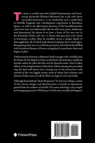 To most, it would seem that English businessman and horse-racing aficionado Richard Montrose has it all, with three successful businesses-a car dealership and a small farm in Norfolk, England, and a development corporation in Barcelona, Spain-as well as the affectionate devotion of the beautiful Jennifer (who loves him unconditionally). But he still wants more. Ambitious and determined, his dream is to have a horse of his own run in the Kentucky Derby and win-a dream that gets just a bit closer to becoming a reality when he stumbles across a unique family of thoroughbreds, all of which look identical (despite their varied ages). Recognizing their once-in-a-lifetime potential, and with his head filled with revitalized dreams of horse-racing glory, he purchases them and begins to plan. Unfortunately, between a dishonest bank manager who carefully pins the blame for his illegal activities on Richard, threatening to implicate Jennifer unless he takes the fall, and the Spanish mafia, who've taken offense at his doing business in Barcelona without kissing the proverbial ring, his luck with horses isn't carrying over to his interactions with animals of the two-legged variety, most of whom have schemes and dreams of their own, not all of which are legal or even survivable. Although fictionalized, "about 65 percent" of American Ringer, a story of love, deceit, danger, and determination, is based on experiences gained from the author's actual life. Of course, this begs a very simple and intriguing question: Which parts of this story actually did happen?