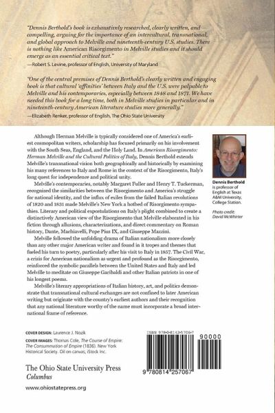 Although Herman Melville is typically considered one of America's earliest cosmopolitan writers, scholarship has focused primarily on his involvement with the South Seas, England, and the Holy Land. In American Risorgimento: Herman Melville and the Cultural Politics of Italy, Dennis Berthold extends Melville's transnational vision both geographically and historically by examining his many references to Italy and Rome in the context of the Risorgimento, Italy's long quest for independence and political unity. Melville's contemporaries, notably Margaret Fuller and Henry T. Tuckerman, recognized the similarities between the Risorgimento and America's struggle for national identity, and the influx of exiles from the failed Italian revolutions of 1820 and 1831 made Melville's New York a hotbed of Risorgimento sympathies. Literary and political expostulations on Italy's plight combined to create a distinctively American view of the Risorgimento that Melville elaborated in his fiction through allusions, characterizations, and direct commentary on Roman history, Dante, Machiavelli, Pope Pius IX, and Giuseppe Mazzini. Melville followed the unfolding drama of Italian nationalism more closely than any other major American writer and found in it tropes and themes that fueled his turn to poetry, particularly after his visit to Italy in 1857. The Civil War, a crisis for American nationalism as urgent and profound as the Risorgimento, reinforced the symbolic parallels between the United States and Italy and led Melville to meditate on Giuseppe Garibaldi and other Italian patriots in one of his longest poems. Melville's literary appropriations of Italian history, art, and politics demonstrate that transnational cultural exchanges are not confined to later American writing but originate with the country's earliest authors and their recognition that any national literature worthy of the name must incorporate a broad international frame of reference. Dennis Berthold is professor of English at Texas A&M University, College Station.