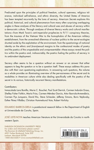 Predicated upon the principles of political freedom, cultural openness, religious tolerance, individual self-reliance and ethnic diversity, the United States of America has been tempted recurrently by the lures of the secret. This political, historical and cultural phenomenon is explored here from many, often surprisingly overlapping angles in these analyses of the literary and cultural uses and abuses of secrecy within a democratic culture. These essays reveal the politics within the poetics and, indissociably, the poetics fueling the politics of secrecy in its ambivalent deployment.