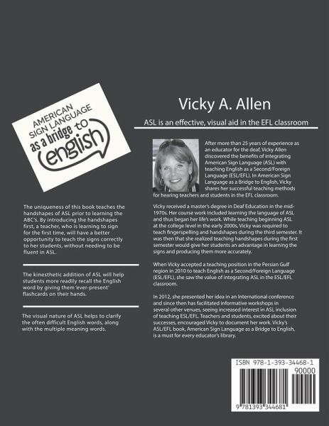 After more than 25 years of experience as an educator for the deaf, Vicky Allen discovered the benefits of integrating American Sign Language (ASL) with teaching English as a Second/Foreign Language (ESL/EFL). In American Sign Language as a Bridge to English, Vicky shares her successful teaching methods for hearing teachers and students in the EFL classroom. Vicky received a master's degree in Deaf Education in the mid 1970s. Her course work included learning the language of ASL and thus began her life’s work. While teaching beginning ASL at the college level in the early 2000s, Vicky was required to teach fingerspelling and handshapes during the third semester. It was then that she realized teaching handshapes during the first semester would give her students an advantage in learning the signs and producing them more accurately. When Vicky accepted a teaching position in the Persian Gulf region in 2010 to teach English as a Foreign Language, she saw the value of integrating ASL in the ESL/EFL classroom. In 2012, she presented her idea at an international conference and since then has facilitated informative workshops in several other venues, seeing increased interest in ASL inclusion of teaching ESL/EFL. Teachers and students, excited about their successes, encouraged Vicky to document her work. Vicky's book, American Sign Language as a Bridge to English, is a must for every educator’s library.
