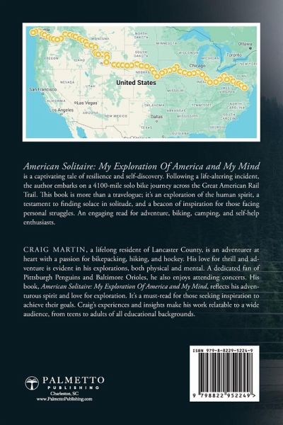 Solo Bike Journey: A 4100-Mile Trek Across the Great American Rail Trail, A Testament to Resilience and Self-Discovery Amidst Personal Struggles. American Solitaire: My Exploration Of America and My Mind is a riveting narrative that takes you on an extraordinary journey across the Great American Rail Trail. The author, after experiencing a life-altering incident, finds himself at a crossroads. With no clear direction and a mind filled with uncertainty, he turns to his bike, his only constant in a world of chaos. The book chronicles his solo bike journey, a staggering 4100 miles from Washington DC to La Push, Washington, on the Pacific Ocean on the Olympic Peninsula. It is not just a physical journey, but also a deep exploration of his mental landscape. The author uses the solitude of the trail and the rhythm of the wheels to navigate through his thoughts, fears, and hopes. This book is a testament to the human spirit's resilience. It is about finding solace in solitude, strength in vulnerability, and meaning in the mundane. It is a story of self-discovery and self-belief, of facing one's demons and emerging stronger. American Solitaire: My Exploration Of America and My Mind is a beacon of inspiration for those seeking to overcome personal struggles. It is a reminder that sometimes, the path to healing and understanding oneself lies in embracing solitude and embarking on a journey, not just outside, but within. This book is a must-read for anyone seeking inspiration, anyone who enjoys tales of personal triumph, and of course, for those who find joy in biking and camping. It transcends age, gender, and educational background, appealing to a broad spectrum of readers. It is not just a story; it is an experience, a journey that the author invites you to join. So, hop on and embark on this incredible journey of resilience, self-discovery, and exploration of America and the mind. A higher-quality edition with COLOR photos is exclusively available at myamericansolitaire.com.