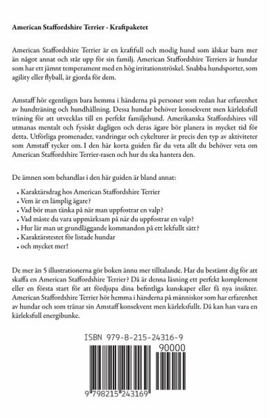 American Staffordshire Terrier - Kraftpaketet American Staffordshire Terrier är en kraftfull och modig hund som älskar barn mer än något annat och står upp för sin familj. American Staffordshire Terriers är hundar som har ett jämnt temperament med en hög irritationströskel. Snabba hundsporter, som agility eller flyball, är gjorda för dem. Amstaff hör egentligen bara hemma i händerna på personer som redan har erfarenhet av hundträning och hundhållning. Dessa hundar behöver konsekvent men kärleksfull träning för att utvecklas till en perfekt familjehund. Amerikanska Staffordshires vill utmanas mentalt och fysiskt dagligen och deras ägare bör planera in mycket tid för detta. Utförliga promenader, vandringar och cykelturer är precis den typ av aktiviteter som Amstaff tycker om. I den här korta guiden får du veta allt du behöver veta om American Staffordshire Terrier-rasen och hur du ska hantera den. De ämnen som behandlas i den här guiden är bland annat:Karaktärsdrag hos American Staffordshire Terrier Vem är en lämplig ägare? Vad bör man tänka på när man uppfostrar en valp? Vad måste du vara uppmärksam på när du uppfostrar en valp? Hur lär man ut grundläggande kommandon på ett lekfullt sätt? Karaktärstestet för listade hundar och mycket mer! De mer än 5 illustrationerna gör boken ännu mer tilltalande. Har du bestämt dig för att skaffa en American Staffordshire Terrier? Då är denna läsning ett perfekt komplement eller en första start för att fördjupa dina befintliga kunskaper eller få nya insikter. American Staffordshire Terrier hör hemma i händerna på människor som har erfarenhet av hundar och som tränar sin Amstaff konsekvent men kärleksfullt. Då kan han vara en kärleksfull energibunke.