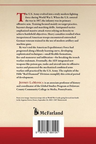 The U.S. Army evolved into a truly modern fighting force during World War I. When the U.S. entered the war in 1917, the infantry was its primary offensive arm. Training focused mainly on target practice, bayonet charges and marching drills. Antiquated tactics emphasized massive attack waves relying on ferocity to achieve battlefield objectives. Heavy casualties resulted when inexperienced American troops encountered entrenched German veterans trained in the use of modern artillery and machine guns. By war's end the American Expeditionary Force had progressed along a bloody learning curve, developing sophisticated techniques--small flexible formations, fire-and-maneuver and infiltration--for breaking the trench warfare stalemate. Eventually, the AEF integrated new weapons like poison gas, tanks and aircraft into its offensive tactics and pioneered the mechanized combined arms warfare still practiced by the U.S. Army. The exploits of the Fifth "Red Diamond" Division exemplify this critical period of development.