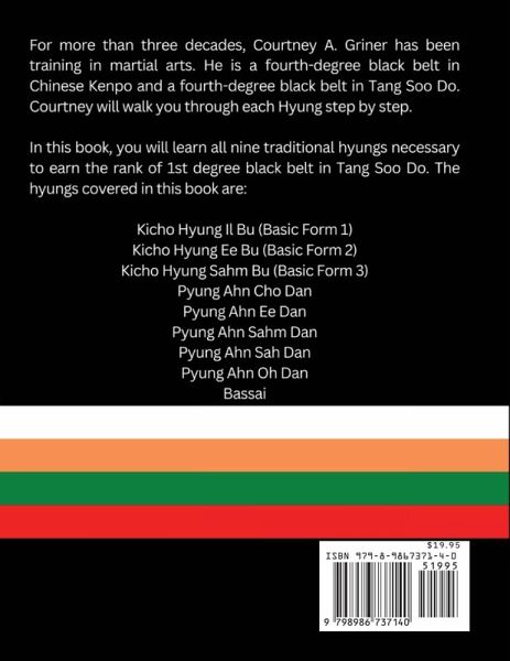 This book is essential if you want to master all nine forms (hyungs) required to earn the rank of 1st degree black belt in the Korean martial art of Tang Soo Do. This book contains hundreds of illustrative photos that will walk you through each form step by step and in great detail. This book is an excellent study guide for beginners and advanced students. The Hyungs covered in this book are: Kicho Hyung Il Bu (Basic Form 1) Kicho Hyung Ee Bu (Basic Form 2) Kicho Hyung Sahm Bu (Basic Form 3) Pyung Ahn Cho Dan Pyung Ahn Ee Dan Pyung Ahn Sahm Dan Pyung Ahn Sah Dan Pyung Ahn Oh Dan Bassai