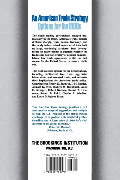 " The world trading envionment changed dramatically in the 1980s. America's trade balance declined sharply, while Japan, Germany, and the newly industrialized countries of Asia built up large, continuing surpluses. Such developments led many people to question whether the traditional postwar strategy of reliance on multilateral free trade agreements is still the best course for the United States, or even a viable one. The challenges to the multilateral system are both practical and theoretical. Various nations are already forming ""free trade"" blocs-- notably the Europe 1992 and the Canadian-American trade arrangements. The United States has increasingly bypassed the GATT and bargained bilaterally in trade disputes, especially with Japan. Several prominent economists have developed new theories that support a more active role for the government to help shape technological change and improve the competitive position of the United States in world markets. Others strongly defend the current arrangements and caution that greater reliance on bilateral bargaining and trading blocs will lead to fragmented world trade and cartel-like arrangements among a few major producers. They are even more skeptical of an interventionist government successfully ""managing"" trade. An American Trade Strategy assesses options for the decade ahead, examining the case for mulitlateral free trade, aggressive bilateralism, and managed trade, as well as their shortcomings. The editors and contributors evaluate the alternative strategies and reflect on their implications for the future direction of American trade policy."