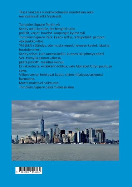 Tässä rankassa runokokoelmassa muututaan sekä mentaalisesti että fyysisesti. Tompkins Square Parkin yö Sandy astui kadulle, ilta hengitti tulta, poliisit, varjot, huudot kaupungin kylmä syli. Tompkins Square Park, kaaos syttyi, ratsupoliisit, pamput, väkijoukko yltyi. Yhtäkkiä räjähdys, yön musta repesi, hevosen kaviot, iskut ja huutojen meri. Sandy seisoi, kuin unessa kellui, kunnes iski pimeys peitti. Veri tyynyllä aamun valossa, päätä jyskytti, maailma keinui. Ei vakuutusta, ei lääkärin lohtua, vain Alphabet Cityn pauhu ja savu. Viikon verran hehkuvat kadut, sitten hiljaisuus laskeutui harmaana. Mutta muisto ei haihtunut, Tompkins Square paloi mielessä aina.