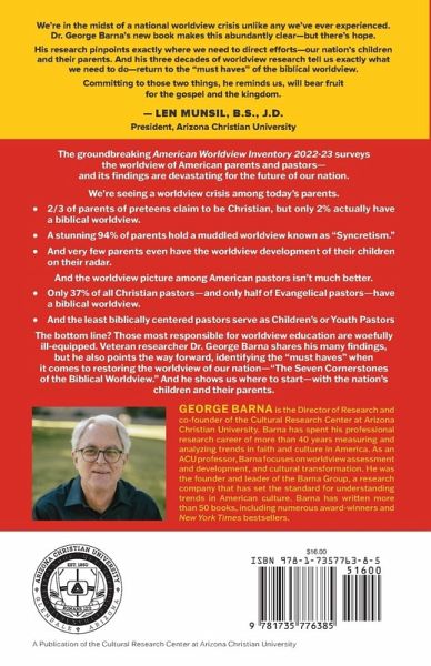 American Worldview Inventory 2022-23 offers a groundbreaking study of the worldview of American parents and pastors-and its findings are devastating for the future of our nation. We're seeing a worldview crisis among today's parents. The research shows that 2/3 of parents of preteens claim to be Christian, but only 2% actually have a biblical worldview. A stunning 94% of parents hold a muddled worldview known as "Syncretism." And very few parents even have the worldview development of their children on their radar. And the worldview picture among American pastors isn't much better. Only 37% of all Christian pastors-and only half of Evangelical pastors-have a biblical worldview. And the least biblically centered pastor, by a substantial margin, serve as Children's or Youth Pastors. The bottom line? Those most responsible for worldview education are woefully ill-equipped for the task. Veteran researcher Dr. George Barna shares his many findings, but he also points the way forward, identifying the "must haves" when it comes to restoring the worldview of our nation-"The Seven Cornerstones of the Biblical Worldview." And he shows us where to start-with the nation's children and their parents.