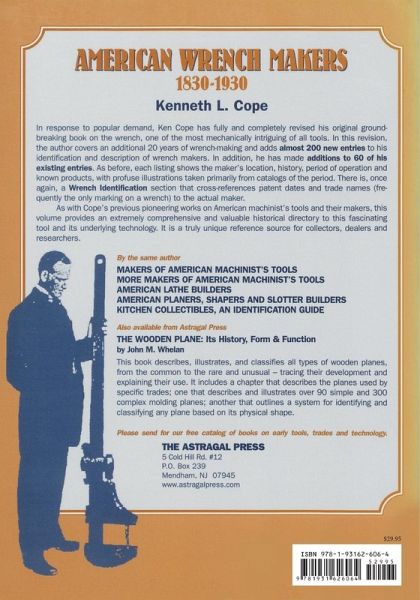 Tool collectors will appreciate this well organized, comprehensive catalog of American wrenches and their makers. Following a list of wrench patent dates with the names of their makers is the catalog of wrenches, organized alphabetically by maker. Each entry includes a short history of the company and their wrenches with illustrations of each wrench, in b&w. An appendix contains an interview with Loring Coes.