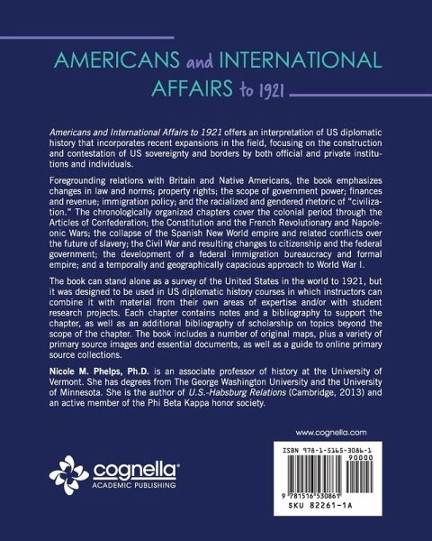 Americans and International Affairs to 1921 offers an interpretation of US diplomatic history that incorporates recent expansions in the field, focusing on the construction and contestation of US sovereignty and borders by both official and private institutions and individuals. Foregrounding relations with Britain and Native Americans, the book emphasizes changes in law and norms; property rights; the scope of government power; finances and revenue; immigration policy; and the racialized and gendered rhetoric of "civilization." The chronologically organized chapters cover the colonial period through the Articles of Confederation; the Constitution and the French Revolutionary and Napoleonic Wars; the collapse of the Spanish New World empire and related conflicts over the future of slavery; the Civil War and resulting changes to citizenship and the federal government; the development of a federal immigration bureaucracy and formal empire; and a temporally and geographically capacious approach to World War I. The book can stand alone as a survey of the United States in the world to 1921, but it was designed to be used in US diplomatic history courses in which instructors can combine it with material from their own areas of expertise and/or with student research projects. Each chapter contains notes and a bibliography to support the chapter, as well as an additional bibliography of scholarship on topics beyond the scope of the chapter. The book includes a number of original maps, plus a variety of primary source images and essential documents, as well as a guide to online primary source collections.