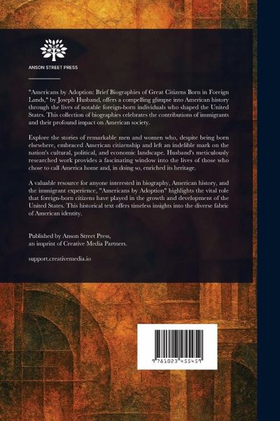 "Americans by Adoption: Brief Biographies of Great Citizens Born in Foreign Lands," by Joseph Husband, offers a compelling glimpse into American history through the lives of notable foreign-born individuals who shaped the United States. This collection of biographies celebrates the contributions of immigrants and their profound impact on American society. Explore the stories of remarkable men and women who, despite being born elsewhere, embraced American citizenship and left an indelible mark on the nation's cultural, political, and economic landscape. Husband's meticulously researched work provides a fascinating window into the lives of those who chose to call America home and, in doing so, enriched its heritage. A valuable resource for anyone interested in biography, American history, and the immigrant experience, "Americans by Adoption" highlights the vital role that foreign-born citizens have played in the growth and development of the United States. This historical text offers timeless insights into the diverse fabric of American identity. This work has been selected by scholars as being culturally important, and is part of the knowledge base of civilization as we know it. This work is in the public domain in the United States of America, and possibly other nations. Within the United States, you may freely copy and distribute this work, as no entity (individual or corporate) has a copyright on the body of the work. Scholars believe, and we concur, that this work is important enough to be preserved, reproduced, and made generally available to the public. We appreciate your support of the preservation process, and thank you for being an important part of keeping this knowledge alive and relevant.