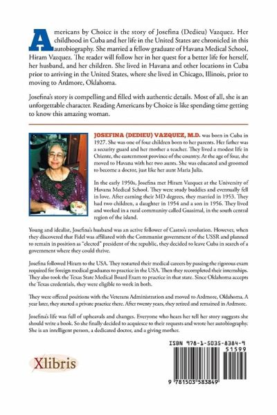 Josefina (Dedieu) Vazquez was born in Cuba in 1927. She was one of four children born to her parents. Her father was a security guard and her mother a teacher. They lived a modest life in Oriente, the easternmost province of the country. At the age of four, she moved to Havana with her two aunts. She was educated and groomed to become a doctor, just like her aunt Maria Julia. In the early 1950s, Josefina met Hiram Vazquez at the University of Havana Medical School. They were study buddies and eventually fell in love. After earning their MD degrees, they married in 1953. They had two children, a daughter in 1954 and a son in 1956. They lived and worked in a rural community called Guasimal, in the south central region of the island. Young and idealist, Josefina's husband was an active follower of Castro's revolution. However, when they discovered that Fidel was affiliated with the Communist government of the USSR and planned to remain in position as "elected" president of the republic, they decided to leave Cuba in search of a government where they could thrive. Josefina followed Hiram to the USA. They restarted their medical careers by passing the rigorous exam required for foreign medical graduates to practice in the USA. Then they recompleted their internships. They also took the Texas State Medical Board Exam to practice in that state. Since Oklahoma accepts the Texas credentials, they were eligible to work in both. They were offered positions with the Veterans Administration and moved to Ardmore, Oklahoma. A year later, they started a private practice there. After twenty years, they retired and remained in Ardmore. Josefina's life was full of upheavals and changes. Everyone who hears her tell her story suggests she should write a book. So she finally decided to acquiesce to their requests and wrote her autobiography. She is an intelligent person, a dedicated doctor, and a giving mother.