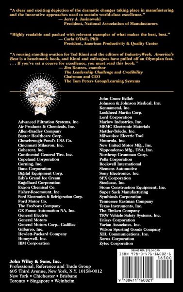 In 1990, IndustryWeek magazine established a prestigious new competition, the America's Best Plants Award, designed to recognize and honor the top manufacturing operations in the nation. To date, sixty-two companies--from such well-known names as Hewlett-Packard, Sony Electronics, Steelcase, and Xerox to smaller companies such as Zytec, John Crane Belfab, and Lord Corporation--have earned the illustrious designation of being one of America's Best Plants. Now these award-winning plants are profiled in America's Best, a unique reference that takes an in-depth look at leading-edge manufacturing practices. Detailing the individual components of world-class manufacturing, while providing personal experience from the field, America's Best offers practical guidelines that will help managers make strategic decisions regarding their own organizations. The book begins with the nine essential components of world-class manufacturing, their individual make-up, and how they interact with each other. These components--customer focus, quality, agility, employee involvement, strong supplier relations, technology, new product development, green manufacturing, community involvement--come together to create the basis of manufacturing excellence and will serve as a road map for improving your organization, your products, and your people. Profiles of each of the 62 Best Plant winners celebrate individual excellence in the field. Highlighting these profiles are on-site visit reports by IndustryWeek editors; detailed coverage of the many unique programs, tools, and techniques currently in use at each plant; and a listing of contact information for individual plants. Also included is a complete set of the winners' statistical measurements for use in benchmarking your own organization, as well as an assessment survey to help you determine how your plant measures up against the best. Filled with helpful data, advice, "lessons," and firsthand stories from Best Plant leaders and employees, America's Best will be essential reading for managers in executive suites to the shop floor who are charged with the success of their manufacturing organization. "A clear and exciting depiction of the dramatic changes taking place in manufacturing and the innovative approaches used to sustain world-class excellence." -- Jerry J. Jasinowski President, National Association of Manufacturers "Highly readable and packed with relevant examples of what makes the best, best." -- Carla O'Dell, PhD President, American Productivity & Quality Center "A rousing standing ovation for Ted Kinni and the editors of IndustryWeek. America's Best is a benchmark book, and Kinni and colleagues have pulled off an Olympian feat. . . . If you've set a course for excellence, you must read this book." -- Jim Kouzes, coauthor The Leadership Challenge and Credibility, Chairman and CEO The Tom Peters Group/Learning Systems Advanced Filtration Systems, Inc. Air Products & Chemicals, Inc. Allen-Bradley Company Baxter Healthcare Corp. Chesebrough-Pond's USA Co. Cincinnati Milacron, Inc. Coherent, Inc. Continental General Tire, Inc. Copeland Corporation Corning, Inc. Dana Corporation Digital Equipment Corp. Edy's Grand Ice Cream Engelhard Corporation Exxon Chemical Co. Fisher-Rosemount, Inc. Ford Electronics & Refrigeration Corp. Ford Motor Co. The Foxboro Company GE Fanuc Automation NA, Inc. General Electric General Motors General Motors Corp., Cadillac Gilbarco, Inc. Hewlett-Packard Company Honeywell, Inc. IBM Corporation John Crane Belfab Johnson & Johnson Medical, Inc. Kennametal, Inc. Lockheed Martin Corp. Lord Corporation Marlow Industries, Inc. MEMC Electronic Materials Mettler-Toledo, Inc. Milwaukee Electric Tool Motorola, Inc. New United Motor Mfg., Inc. Nippondenso Mfg., USA, Inc. Northrop Grumman Corp. Pella Corporation Rockwell International Siemens Automotive Sony Electronics, Inc. SPX Corporation Steelcase, Inc. Stone Construction Equipment, Inc. Super Sack Manufacturing Symbiosis Corporation Tennessee Eastman Company Texas Instruments, Inc. The Timken Company TRW Vehicle Safety Systems, Inc. Unisys Corporation Varian Associates, Inc. Wilson Sporting Goods Company XEL Communications, Inc. Xerox Corporation Zytec Corporation