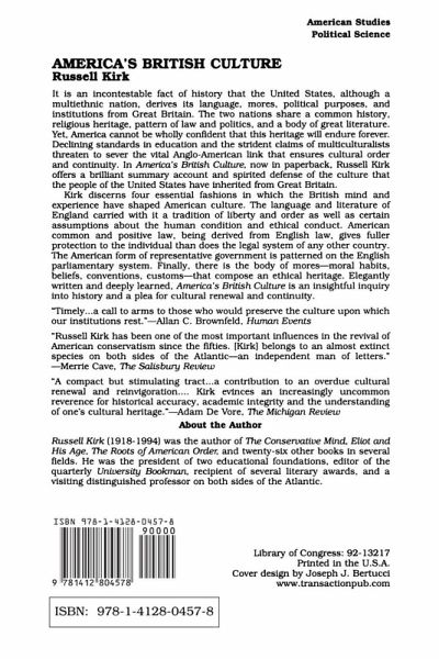 Elegantly written and deeply learned, Americas British Culture is an insightful inquiry into history and a plea for cultural renewal and continuity. Kirk discerns four essential areas of the influence of Great Britain. The language and literature of England carried with it a tradition of liberty and order as well as certain assumptions about the human condition and ethical conduct. American common and positive law, being derived from English law, gives fuller protection to the individual than does the legal system of any other country. The American form of representative government is patterned on the English parliamentary system. Finally, there is the body of mores - moral habits, beliefs, conventions, customs - that compose an ethical heritage.