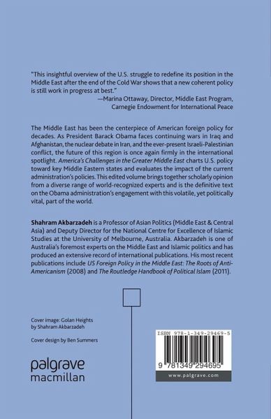 'In Akbarzadeh's compilation, the United States' strategic relationships in the Middle East are evaluated in light of recent events, from the beginning of Obama's presidency to the revolutions which characterized the 2011 Arab Spring. The articlesbring together a wide range of scholars who write about subjects as diverse as the challenges confronting the Obama Administration in Afghanistan, the risk of the US losing its moral appeal in Central Asia, and the decisions the US must make in supporting Egypt's transition to democracy.'