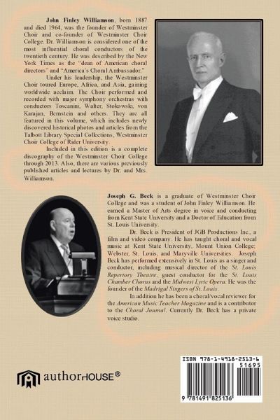 John Finley Williamson, born 1887 and died 1964, was the founder of Westminster Choir and co-founder of Westminster Choir College. Dr. Williamson is considered one of the most influential choral conductors of the twentieth century. He was described by the New York Times as the "dean of American choral directors" and "America's Choral Ambassador." Under his leadership, the Westminster Choir toured Europe, Africa, and Asia gaining worldwide acclaim. The Choir performed and recorded with major symphony orchestras with conductors Toscanini, Walter, Stokowski, Von Karajan, Bernstein and others. They are all featured in this volume, which includes newly discovered historical photos and articles from the Talbott Library Special Collections, Westminster Choir College of Rider University. Included in this edition is a complete discography of the Westminster Choir College through 2013. Also there are various previously published articles and lectures by Dr. and Mrs. Williamson.