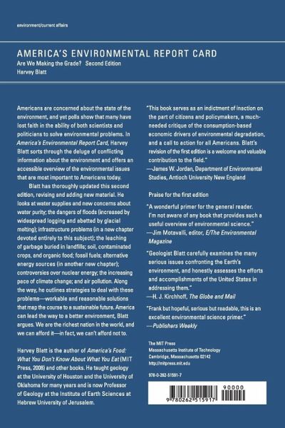 An accessible overview of the most important environmental issues facing the United States, with new and updated material. Americans are concerned about the state of the environment, and yet polls show that many have lost faith in both scientists' and politicians' ability to solve environmental problems. In America's Environmental Report Card, Harvey Blatt sorts through the deluge of conflicting information about the environment and offers an accessible overview of the environmental issues that are most important to Americans today. Blatt has thoroughly updated this second edition, revising and adding new material. He looks at water supplies and new concerns about water purity; the dangers of floods (increased by widespread logging and abetted by glacial melting); infrastructure problems (in a new chapter devoted entirely to this subject); the leaching of garbage buried in landfills; soil, contaminated crops, and organic food; fossil fuels; alternative energy sources (in another new chapter); controversies over nuclear energy; the increasing pace of climate change; and air pollution. Along the way, he outlines ways to deal with these problems—workable and reasonable solutions that map the course to a sustainable future. America can lead the way to a better environment, Blatt argues. We are the richest nation in the world, and we can afford it—in fact, we can't afford not to.