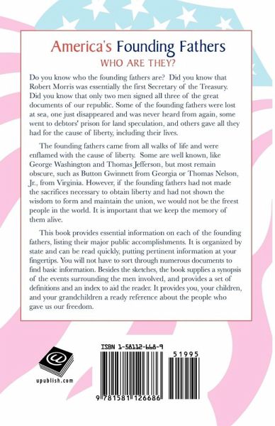 Do you know who the founding fathers are? Did you know that Robert Morris was essentially the first Secretary of the Treasury. Did you know that only two men signed all three of the great documents of our republic. Some of the founding fathers were lost at sea, one just disappeared and was never heard from again, some went to debtors' prison for land speculation, and others gave all they had for the cause of liberty, including their lives. The founding fathers came from all walks of life and were enflamed with the cause of liberty. Some are well known, like George Washington and Thomas Jefferson, but most remain obscure, such as Button Gwinnett from Georgia or Thomas Nelson, Jr., from Virginia. However, if the founding fathers had not made the sacrifices necessary to obtain liberty and had not shown the wisdom to form and maintain the union, we would not be the freest people in the world. It is important that we keep the memory of them alive. This book provides essential information on each of the founding fathers, listing their major public accomplishments. It is organized by state and can be read quickly, putting pertinent information at your fingertips. You will not have to sort through numerous documents to find basic information. Besides the sketches, the book supplies a synopsis of the events surrounding the men involved, and provides a set of definitions and an index to aid the reader. It provides you, your children, and your grandchildren a ready reference about the people who gave us our freedom.