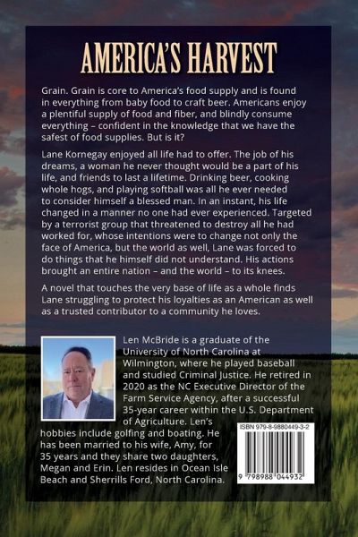Grain. Grain is core to America's food supply and is found in everything from baby food to craft beer. Americans enjoy a plentiful supply of food and fiber, and blindly consume everything - confident in the knowledge that we have the safest of food supplies. But is it? Lane Kornegay enjoyed all life had to offer. The job of his dreams, a woman he never thought would be a part of his life, and friends to last a lifetime. Drinking beer, cooking whole hogs, and playing softball was all he ever needed to consider himself a blessed man. In an instant, his life changed in a manner no one had ever experienced. Targeted by a terrorist group that threatened to destroy all he had worked for, whose intentions were to change not only the face of America, but the world as well, Lane was forced to do things that he himself did not understand. His actions brought an entire nation - and the world - to its knees. A novel that touches the very base of life as a whole finds Lane struggling to protect his loyalties as an American as well as a trusted contributor to a community he loves.