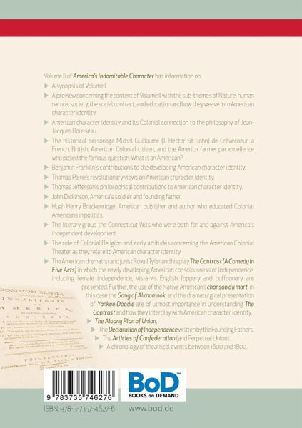 Volume II of America's Indomitable Character has information on: A synopsis of Volume I. A preview concerning the content of Volume II with the sub-themes of Nature, human nature, society, the social contract, and education and how they weave into American character identity. American character identity and its Colonial connection to the philosophy of Jean-Jacques Rousseau. The historical personage Michel Guillaume (J. Hector St. John) de Crèvecoeur, a French, British, American Colonial citizen, and the America farmer par excellence who posed the famous question: What is an American? Benjamin Franklin's contributions to the developing American character identity. Thomas Paine's revolutionary views on American character identity. Thomas Jefferson's philosophical contributions to American character identity. John Dickinson, America's soldier and founding father. Hugh Henry Brackenridge, American publisher and author who educated Colonial Americans in politics. The literary group the Connecticut Wits who were both for and against America's independent development. The role of Colonial Religion and early attitudes concerning the American Colonial Theater as they relate to American character identity. The American dramatist and jurist Royall Tyler and his play The Contrast (A Comedy in Five Acts) in which the newly developing American consciousness of independence, including female independence, vis-à-vis English foppery and buffoonery are presented. Further, the use of the Native American's chanson du mort, in this case the Song of Alknomook and the dramaturgical presentation of Yankee Doodle are of utmost importance in understanding The Contrast and how they interplay with American character identity. The Albany Plan of Union. The Declaration of Independence written by the Founding Fathers. The Articles of Confederation (and Perpetual Union). A chronology of theatrical events between 1600 and 1800.