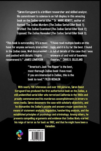 With nearly 700 references and over 200 pictures, Søren Roest Korsgaard has produced the first authoritative book on the Zodiac, a still unidentified serial killer who terrorized California in the 1960s and proudly commemorated his murderous accomplishments in letters to news media. Søren documents the case with scholarly objectivity, and he dismantles the Zodiac's psyche and answers major questions by means of statement analysis, linguistics, handwriting analysis, and the established principles of psychology and criminology. Among others, he presents compelling arguments and evidence that Zodiac likely started his reign of terror as far back as 1962, and that he might have been a Canadian.