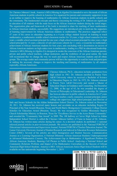America's MIA (Missing in Algebra I) is intended to serve the needs of African American students in public schools in America. It is organized for parents and community supporters to use as an outline to improve the learning of mathematics by African American students in public schools and the community. The fundamental concepts and theory concerning the writing of this book are significant to education of all students with the main focus on the African American students during the initial stages. The organization plan and framework of Dr. Johnson's book is intended to share his teaching of basic mathematics to African American students, successfully. The first several chapters will give the framework of the basic organization of the learning community and ways to organize the learning environment. His suggestions are introduced only to motivate the supporters of learning improvement for African American students in mathematics. The practices suggested reflect 47 years of his career in education beginning as a 4-year college student focused on learning to teach mathematics; a mathematics middle school classroom teacher for ten years; a high school counselor for two years; a middle school assistant principal for one year; a high school assistant principal for nine years; a high school principal for 14 years; a director of safe and secure schools for 11 years; a researcher in mathematics achievement of African American students for four years; and concluding with a dissertation on success of African American students on high-stakes tests in mathematics, leading to a PhD in educational leadership. America's MIA (Missing in Algebra I), written by Dr. Johnson is designed to awake the conscious of the African American parents; private and public school teachers, college instructors, and the workforce of our great nation. His book recommends that we change the way we teach and respect African American students and all ethnic groups. The average reader and community person will have the opportunity to read his book and participate in making the necessary changes to improve the teaching and learning of mathematics by all students especially, African Americans.