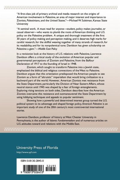 In a revisionist look at the history of U.S. relations with Palestine, Lawrence Davidson offers a critical study of the evolution of American popular and governmental perceptions of Zionism and Palestine, from the Balfour Declaration of 1917 to the founding of Israel in 1948. Showing how a powerful and determined interest group turned the U.S. political system to its advantage and shaped foreign policy, America's Palestine is an important study of one of the 20th century's most controversial international stories.