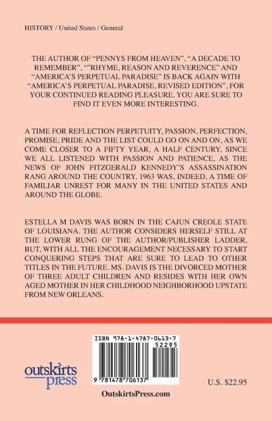 ABOUT THE BOOK: IN "AMERICA'S PERPETUAL PARADISE, REVISED EDITION", THE AUTHOR GOES IN DEPTH TO SHOW, BY AIRING SOME OF BOTH, DIRTY AND CLEAN LAUNDRY IN SOME INSTANCES, SOME ASPECTS OF THE COUNTRY AND IT'S USUAL ACTIVITIES AND EXPECTATIONS RELATIVE TO THE PROMISE AND DREAM OF PROSPERITY FOR ALL. SHE STRESSES HOW HAVING COME FULL CIRCLE IN A QUEST FOR FREEDOM, LIBERTY, JUSTICE AND EQUALITY, SURELY OUR HOPES FOR A CONTINUED HAPPINESS TO INCLUDE ALL, IS A FULL REALITY TODAY. THE AUTHOR IS CAREFUL TO INCLUDE VIEWS OF HER OWN AS WELL AS THOSE OF OTHERS TO ARRIVE AT WHAT CAN BE CONSTRUED TODAY AS A PLACE WHERE PROMISE AND DREAMS ARE REALIZED BY AVERAGE EVERYDAY PEOPLE AS WELL AS THE FAMED AND CELEBRATED. HER WISH IS THAT YOU WILL MAKE THE BOOK A PART OF YOUR PERSONAL LIBRARY.