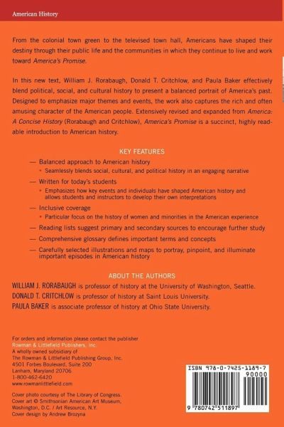 In this text, authors William J. Rorabaugh, Donald T. Critchlow, and Paula Baker effectively blend political, social and cultural history to present a balanced portrait of America's past. Designed to emphasize major themes and events, the work also captures the rich and often amusing character of the American people. Extensively revised and expanded from America: A Concise History (Rorabaugh and Critchlow), America's Promise is a succinct, highly readable introduction to American history.