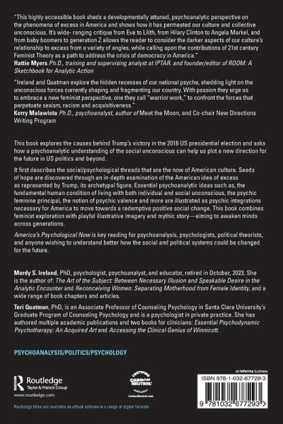 "This highly accessible book sheds a developmentally attuned, psychoanalytic perspective on the phenomena of excess in America and shows how it has permeated our culture and collective unconscious. It's wide-ranging critique; from Eve to Lilith, from Hilary Clinton to Angela Markel, and from the baby boomers to generation Z allows the reader to consider the darker aspects of our culture's relationship to excess from a variety of angles, while calling upon the contributions of 21st century Feminist Theory as a path to address the crisis of democracy in America."