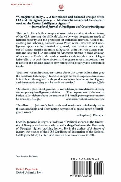 Based on hundreds of interviews with CIA officials, national security experts, and legislators, as well as a thorough culling of the archival record, America's Secret Power offers an illuminating and up-to-date picture of the CIA, stressing the difficult balance between the genuine needs of national security and the protection of individual liberties. Loch Johnson, who has studied the workings of the CIA at first hand as a legislative overseer, presents a comprehensive examination of the Agency and its relations with other American institutions, including Congress and the White House, and looks closely at how it pursues its three major missions--intelligence analysis, counterintelligence, and covert action. At once fascinating and sobering, Johnson's book reveals how the best intelligence reports can be distorted or ignored; how covert actions can spin out of control despite extensive safeguards, as in the Iran-Contra scandal; and how the CIA has spied on American citizens in clear violation of its charter. Further, he provides a thorough review of legislative efforts to curb these abuses, and suggests several important ways to achieve the delicate balance between national security and democratic ideals.