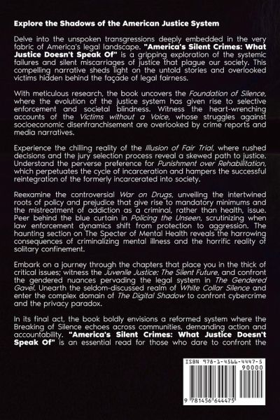 Explore the Shadows of the American Justice System Delve into the unspoken transgressions deeply embedded in the very fabric of America's legal landscape. "America's Silent Crimes: What Justice Doesn't Speak Of" is a gripping exploration of the systemic failures and silent miscarriages of justice that plague our society. This compelling narrative sheds light on the untold stories and overlooked victims hidden behind the façade of legal fairness. With meticulous research, the book uncovers the Foundation of Silence, where the evolution of the justice system has given rise to selective enforcement and societal blindness. Witness the heart-wrenching accounts of the Victims without a Voice, whose struggles against socioeconomic disenfranchisement are overlooked by crime reports and media narratives. Experience the chilling reality of the Illusion of Fair Trial, where rushed decisions and the jury selection process reveal a skewed path to justice. Understand the perverse preference for Punishment over Rehabilitation, which perpetuates the cycle of incarceration and hampers the successful reintegration of the formerly incarcerated into society. Reexamine the controversial War on Drugs, unveiling the intertwined roots of policy and prejudice that give rise to mandatory minimums and the mistreatment of addiction as a criminal, rather than health, issue. Peer behind the blue curtain in Policing the Unseen, scrutinizing when law enforcement dynamics shift from protection to aggression. The haunting section on The Specter of Mental Health reveals the harrowing consequences of criminalizing mental illness and the horrific reality of solitary confinement. Embark on a journey through the chapters that place you in the thick of critical issues; witness the Juvenile Justice: The Silent Future, and confront the gendered nuances pervading the legal system in The Gendered Gavel. Unearth the seldom-discussed realm of White Collar Silence and enter the complex domain of The Digital Shadow to confront cybercrime and the privacy paradox. In its final act, the book boldly envisions a reformed system where the Breaking of Silence echoes across communities, demanding action and accountability. "America's Silent Crimes: What Justice Doesn't Speak Of" is an essential read for those who dare to confront the uncomfortable truths of our justice system and seek a path toward genuine reform.