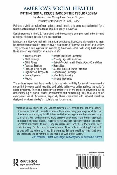 Calling for a fundamental change in the focus of public policy in America, this book paints a vivid portrait of the nation's social health. Miringoff and Opdycke clearly show that social progress has stalled and the country's energies need to be directed at critical domestic issues in the years ahead.The authors propose a new agenda for monitoring America's social well-being built around sixteen key indicators of American life, such as infant mortality, teenage suicide, health insurance coverage, and affordable housing. They maintain that social conditions, like economic conditions, must be constantly monitored in order to have a clear sense of "how we are doing" as a society.The book builds on the work of the Institute for Innovation in Social Policy and argues that there needs to be a greater visibility for social issues - and a closer link between social reporting and public action - to better address the nation's social problems. It considers the critical role of the media in advancing public understanding of social issues, and examines important advances in the community indicators movement and international social reporting. Eye-opening and compelling, the book is a provocative centerpiece for policy debates and national initiatives on today's crucial domestic concerns.