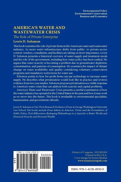 This book examines the role of private firms in the American water and wastewater industry. As more water infrastructure shifts from public- to private-sector control, vendors, consultants, and facilities are taking on more importance. Lewis D. Solomon presents an historical overview of water supply and treatment needs and the role of the government, including how water policy has been crafted. He argues that water scarcity is becoming a problem due to groundwater depletion, contamination, and patterns of consumption. He examines the impact of climate change on water availability and quality considering voluntary conservation programs and mandatory restrictions for water use. Solomon points to how for-profit firms can use technology to increase water supply. He describes what privatization would look like in practice and reviews evidence from two case studies. Solomon proposes privatization as a viable response to America's water crisis that can address both scarcity and capital problems. America's Water and Wastewater Crisis presents a careful examination of how the water industry has operated in the United States in the past and how it may work as we move into the future. This book is invaluable to environmental specialists, businessmen, and government officials.