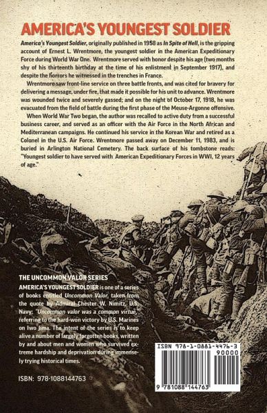 America's Youngest Soldier, originally published in 1958 as In Spite of Hell, is the gripping account of Ernest L. Wrentmore, the youngest soldier in the American Expeditionary Force during World War One. Wrentmore served with honor despite his age (two months shy of his thirteenth birthday at the time of his enlistment in September 1917), and despite the horrors he witnessed in the trenches in France. Wrentmore saw front-line service on three battle fronts, and was cited for bravery for delivering a message, under fire, that made it possible for his unit to advance. Wrentmore was wounded twice and severely gassed; and on the night of October 17, 1918, he was evacuated from the field of battle during the first phase of the Meuse-Argonne offensive. When World War Two began, the author was recalled to active duty from a successful business career, and served as an officer with the Air Force in the North African and Mediterranean campaigns. He continued his service in the Korean War and retired as a Colonel in the U.S. Air Force. Wrentmore passed away on December 11, 1983, and is buried in Arlington National Cemetery. The back surface of his tombstone reads: "Youngest soldier to have served with American Expeditionary Forces in WWI, 12 years of age."