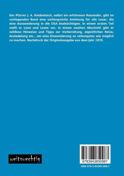 Der Pfarrer J. A. Reidenbach, selbst ein erfahrener Reisender, gibt im vorliegenden Band eine umfangreiche Anleitung für alle Leser, die eine Auswanderung in die USA beabsichtigen. In einem ersten Teil stellt er Land und Leute vor, in einem zweiten Abschnitt gibt er zahllose Hinweise und Tipps zur Vorbereitung, eigentlichen Reise, Ansiedelung etc., um eine Einwanderung so reibungslos wie möglich zu machen. Nachdruck der Originalausgabe aus dem Jahr 1870.