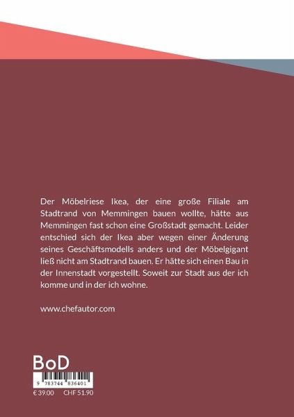 Der Möbelriese Ikea, der eine große Filiale am Stadtrand von Memmingen bauen wollte, hätte aus Memmingen fast schon eine Großstadt gemacht. Leider entschied sich der Ikea aber wegen einer Änderung seines Geschäftsmodells anders und der Möbelgigant ließ nicht am Stadtrand bauen. Er hätte sich einen Bau in der Innenstadt vorgestellt. Soweit zur Stadt aus der ich komme und in der ich wohne.