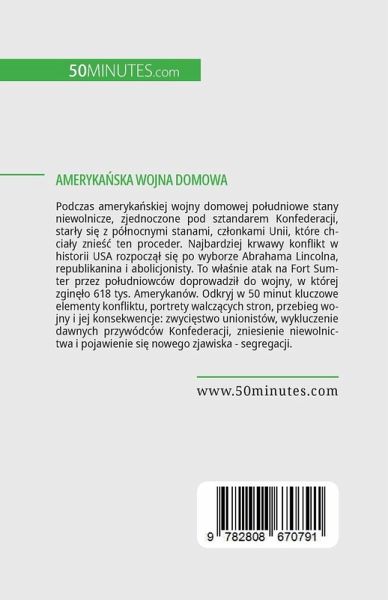 Podczas amerykäskiej wojny domowej po¿udniowe stany niewolnicze, zjednoczone pod sztandarem Konfederacji, star¿y si¿ z pó¿nocnymi stanami, cz¿onkami Unii, które chciäy znie¿¿ ten proceder. Najbardziej krwawy konflikt w historii USA rozpocz¿¿ si¿ po wyborze Abrahama Lincolna, republikanina i abolicjonisty. To w¿änie atak na Fort Sumter przez po¿udniowców doprowadzi¿ do wojny, w której zgin¿¿o 618 tys. Amerykanów. Odkryj w 50 minut kluczowe elementy konfliktu, portrety walcz¿cych stron, przebieg wojny i jej konsekwencje: zwyci¿stwo unionistów, wykluczenie dawnych przywódców Konfederacji, zniesienie niewolnictwa i pojawienie si¿ nowego zjawiska - segregacji.