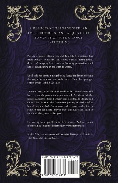 "fantastic worldbuilding and edge-of-your-seat action..." - Goodreads review "I couldn't put it down from the time I opened it." - Amazon Review A reluctant teenage Seer, an evil sorceress, and a quest for power that will change everything Fifteen-year-old Talullah Bridgestone dreams of escaping her town's suffocating protection spell and adventuring in the outside world-until soldiers from a neighboring kingdom break through the magic and kidnap her younger sisters while looking for...her. Now, Talullah must choose: continue ignoring the cloudy visions that have plagued her for the last eight years or swallow her reservations, learn to use her powers, and save her sisters from the sorceress Renevelda's sinister plans. The missing amethyst from her heirloom necklace will help clarify and control her visions. To find it, she must survive the dark forest rumored to steal souls, journey to a realm of the dead, and, maybe most difficult of all, face the ghosts of her past. Her enemy has a spy. Her allies have secrets. And her dream of getting out has just become her worst nightmare. If she fails to master the power she never wanted, the sorceress will rewrite history...and stain it with Talullah's sisters' blood.