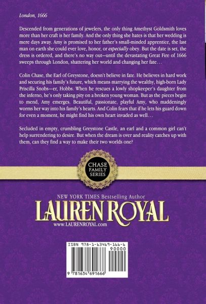 From New York Times bestselling author Lauren Royal comes a very special 20th Anniversary hardback edition of her beloved first novel, Amethyst: Colin Chase, the Earl of Greystone, finds his carefully planned life turned upside down when the Great Fire of London lands a lowly jeweler's daughter in his arms.