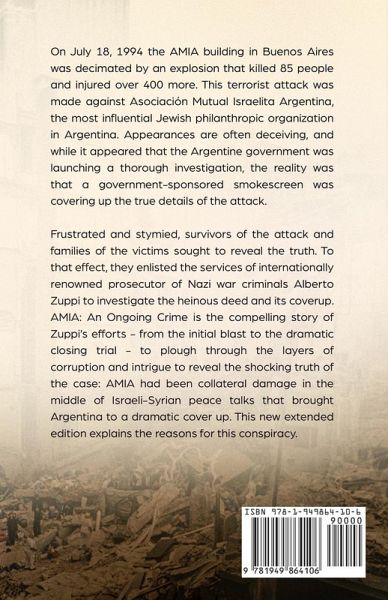 On July 18, 1994 the AMIA building in Buenos Aires was decimated by an explosion that killed 85 people and injured over 400 more. This terrorist attack was made against Asociación Mutual Israelita Argentina, the most influential Jewish philanthropic organization in Argentina. Appearances are often deceiving, and while it appeared that the Argentine government was launching a thorough investigation, the reality was that a government-sponsored smokescreen was covering up the true details of the attack. Frustrated and stymied, survivors of the attack and families of its victims sought to reveal the truth. To that effect, they enlisted the services of internationally renowned prosecutor of Nazi war criminals Alberto Zuppi to investigate the heinous deed and its coverup. AMIA: An Ongoing Crime Extended Edition is the compelling story of Zuppi’s efforts - from the initial blast to the dramatic closing trial - to plough through the layers of corruption and intrigue to reveal the shocking truth of the case.