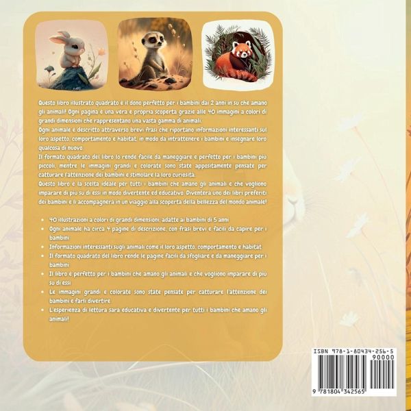 Un fantastico libro illustrato quadrato è il dono perfetto per i bambini dai 2 anni in su che amano gli animali! Ogni pagina è una vera e propria scoperta grazie alle immagini a colori di grandi dimensioni che rappresentano una vasta gamma di animali. Ogni animale è descritto attraverso brevi frasi che riportano informazioni interessanti sul loro aspetto, comportamento e habitat, in modo da intrattenere i bambini e insegnare loro qualcosa di nuovo. Il formato quadrato del libro lo rende facile da maneggiare e perfetto per i bambini più piccoli, mentre le immagini grandi e colorate sono state appositamente pensate per catturare l'attenzione dei bambini e stimolare la loro curiosità. Questo libro è la scelta ideale per tutti i bambini che amano gli animali e che vogliono imparare di più su di essi in modo divertente ed educativo. Diventerà uno dei libri preferiti dei bambini e li accompagnerà in un viaggio alla scoperta della bellezza del mondo animale! 40 illustrazioni a colori di grandi dimensioni, adatte ai bambini di 2 anni in su Ogni animale ha circa 4 pagine di descrizione, con frasi brevi e facili da capire per i bambini Informazioni interessanti sugli animali come il loro aspetto, comportamento e habitat Il formato quadrato del libro rende le pagine facili da sfogliare e da maneggiare per i bambini Il libro è perfetto per i bambini che amano gli animali e che vogliono imparare di più su di essi Le immagini grandi e colorate sono state pensate per catturare l'attenzione dei bambini e farli divertire L'esperienza di lettura sarà educativa e divertente per tutti i bambini che amano gli animali!