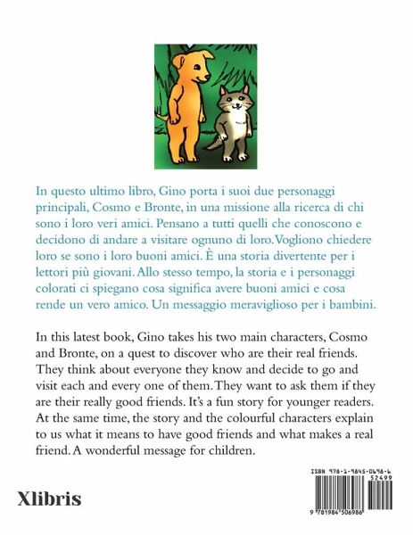 "Amici" is all about knowing who our real friends are. The two main characters, Cosmo and Bronte are on a quest to discover who are their real friends. They think about everyone they know and decide to go and visit each and everyone of them. They want to ask them if they are their really good friends. It's a fun story for young readers written in both English and in Italian. At the same time the story and the colourful characters explain to the reader what it means to have good friends and what makes a good friend. It's a wonderful message for children. "Amici" è tutto di sapere chi sono i nostri veri amici. I due personaggi principali, Cosmo e Bronte, sono in missione per scoprire chi sono i loro veri amici. Pensano a tutti quelli che conoscono e decidono di andare a visitare ognuno di loro. Vogliono chiedere loro se sono i loro buoni amici. È una storia divertente per i lettori più giovani scritta sia in inglese che in italiano. Allo stesso tempo, la storia e i personaggi colorati spiegano al lettore cosa significa avere buoni amici e cosa rende un buon amico. Un messaggio meraviglioso per i bambini.