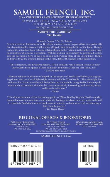 Comic drama / 2m, 6f / Int. At a funeral in an Italian sector of Brooklyn, mourners come to pay tribute to a police officer of questionable character, killed while allegedly defending the life of the Pope. Though each of the attendees has a colorful relationship with the victim, it is the policeman's pregnant mistress who causes a sensation. Will she and her unborn baby be permitted to stay? Was the deceased a hero or just a poor slob in the wrong place at the wrong time? Insults and furies fly as the women, Italian to the core, debate the legacy of this fallen man. "The characters...are Brooklyn Italians...Their ethnicity runs a distant second to their universality; their appeal is their humanity. Sometimes, they are very funny, too." - The New York Times "Human behavior in the face of tragedy is the essence of Amidst the Gladiolas, an engrossing drama with occasional lightweight comedy relief by Vito Gentile...The playwright has endowed his characters with such believable and undeniable recognizable human qualities at such an occasion, that they become automatically interesting, and instantly snare audience involvement." - Variety "The drama has some of the harrowing quality of Who's Afraid of Virginia Woolf? - another drama that moves in real time - and while the baiting and abuse never get quite so horrid in Amidst the Gladiolas, it can be unpleasant to witness, as if one were truly overhearing a bitter family quarrel." - The Bergen Record