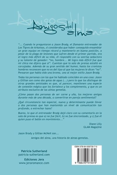 "... Cuando le preguntaron a Jason Brady, el flamante entrenador de Los Tigres de Arkansas, si consideraba que haber conseguido ensamblar un gran equipo en tiempo récord y mantenerlo en buena posición, a pesar de la plaga de lesiones que sufren desde el primer partido, era el logro más difícil de su vida, él respondió con su sonrisa seductora y su talante de ganador: "no, hombre... Mi logro más difícil fue que mi chica me dijera que sí". Cuentan que la sala de prensa estalló en carcajadas. Además de su gran sentido del humor, hasta los cronistas hombres reconocen que no es del tipo al que las mujeres le dicen "no". Pensaron que había sido una broma, una al mejor estilo Jason Brady. Todas las personas con las que he hablado coinciden en una cosa: Jason y Gillian son como dos gotas de agua (...) pero lo que los distingue de otras grandes amistades es que, al parecer, mantienen una especie de conexión mágica que los fortalece y los complementa, y que es un atributo exclusivo de las almas gemelas. ¿Cómo pasan dos personas de ser carne y uña, los mejores amigos durante más de una década, a convertirse en pareja sentimental? ¿Qué circunstancia tan especial, nueva y determinante puede llevar a dos personas que han mantenido un nivel de comunicación tan profundo, a estrechar lazos? Bueno, lo que el entrenador Brady dejó claro con su comentario en la sala de prensa es que a) no fue fácil, b) no fue sincronizado, y c) fue él quien puso el balón en movimiento...". Diane Lilly. GLAM Magazine. Jason Brady y Gillian McNeil son... Amigos del alma, una historia de almas gemelas.