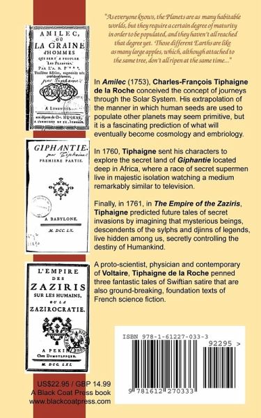 In Amilec (1753), Charles-François Tiphaigne de la Roche conceived the concept of journeys through the Solar System. His extrapolation of the manner in which human seeds are used to populate other planets may seem primitive, but it is a fascinating prediction of what will eventually become cosmology and embriology. In 1760, Tiphaigne sent his characters to explore the secret land of Giphantie located deep in Africa, where a race of secret supermen live in majestic isolation watching a medium remarkably similar to television. Finally, in 1761, in The Empire of the Zaziris, Tiphaigne predicted future tales of secret invasions by imagining that mysterious beings, descendents of the sylphs and djinns of legends, live hidden among us, secretly controlling the destiny of Humankind. A proto-scientist, physician and contemporary of Voltaire, Tiphaigne de la Roche penned three fantastic tales of Swiftian satire that are also ground-breaking, foundation texts of French science fiction.