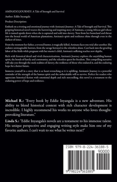 AMINATA'S JOURNEY: A Tale of Strength and Survival Author: Eddie Inyangala Product Description: Embark on a riveting and emotional journey with Aminata's Journey: A Tale of Strength and Survival. This gripping historical novel weaves the harrowing and inspiring story of Aminata, a young African girl whose life is turned upside down when she is captured and sold into slavery. Torn from her homeland and thrust into the brutal world of American plantations, Aminata's spirit and resilience shine through even in the darkest of times. From the moment her father, a revered hunter, is tragically killed, Aminata faces one trial after another. She endures unimaginable horrors, from the savage betrayal to the relentless abuse. Cast back into the grueling labor of the fields while pregnant with her master's child, Aminata's suffering reaches new depths. Rich with historical detail and vivid characterizations, Aminata's Journey explores the unyielding human spirit, the bonds of family and community, and the relentless quest for freedom. This compelling narrative will take you through the stark realities of slavery, the resilience of those who endured it, and the enduring hope for a better future. Immerse yourself in a story that is as heart-wrenching as it is uplifting. Aminata's Journey is a powerful reminder of the strength of the human spirit and the unbreakable will to survive. Perfect for readers who appreciate historical fiction with emotional depth and rich storytelling, this novel is a testament to the enduring power of hope and resilience.